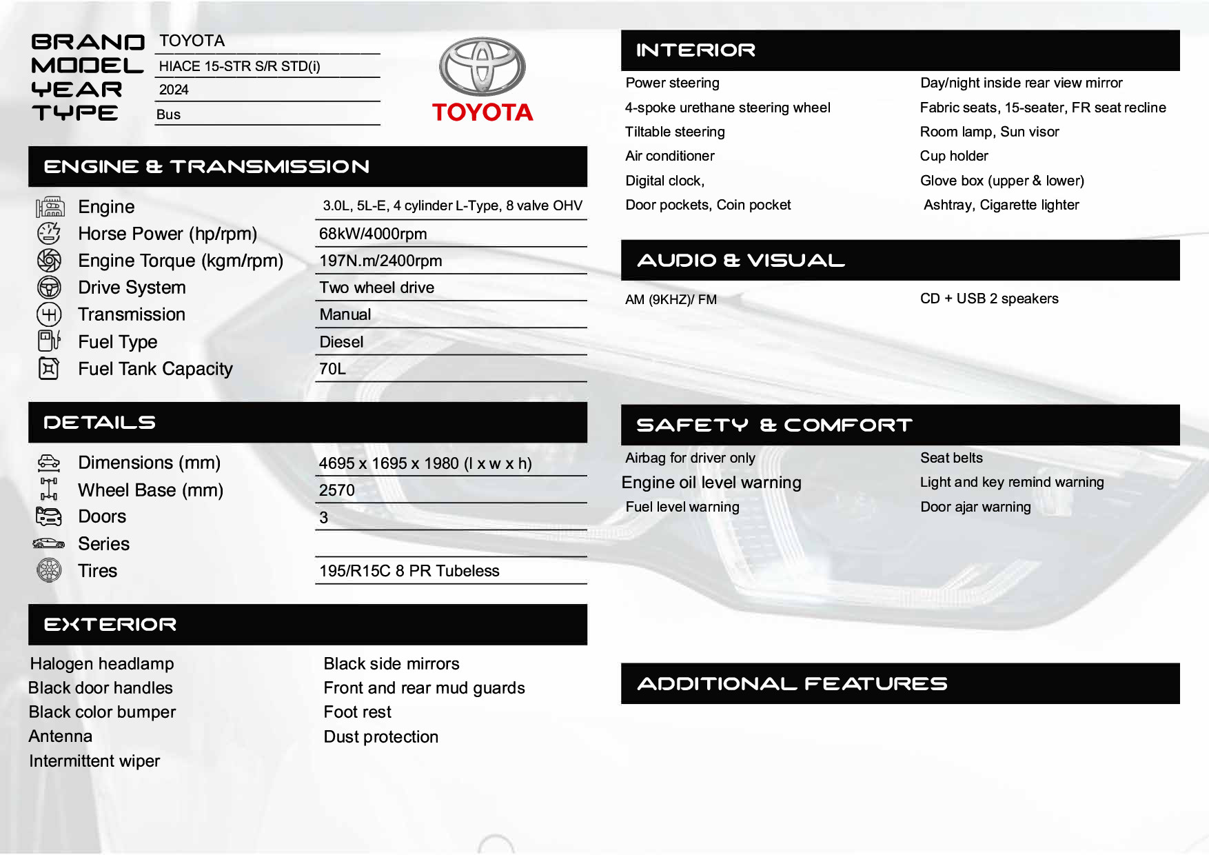 TOYOTA HIACE 3.0L 15-STR S/R STD(i) M/T DIESEL